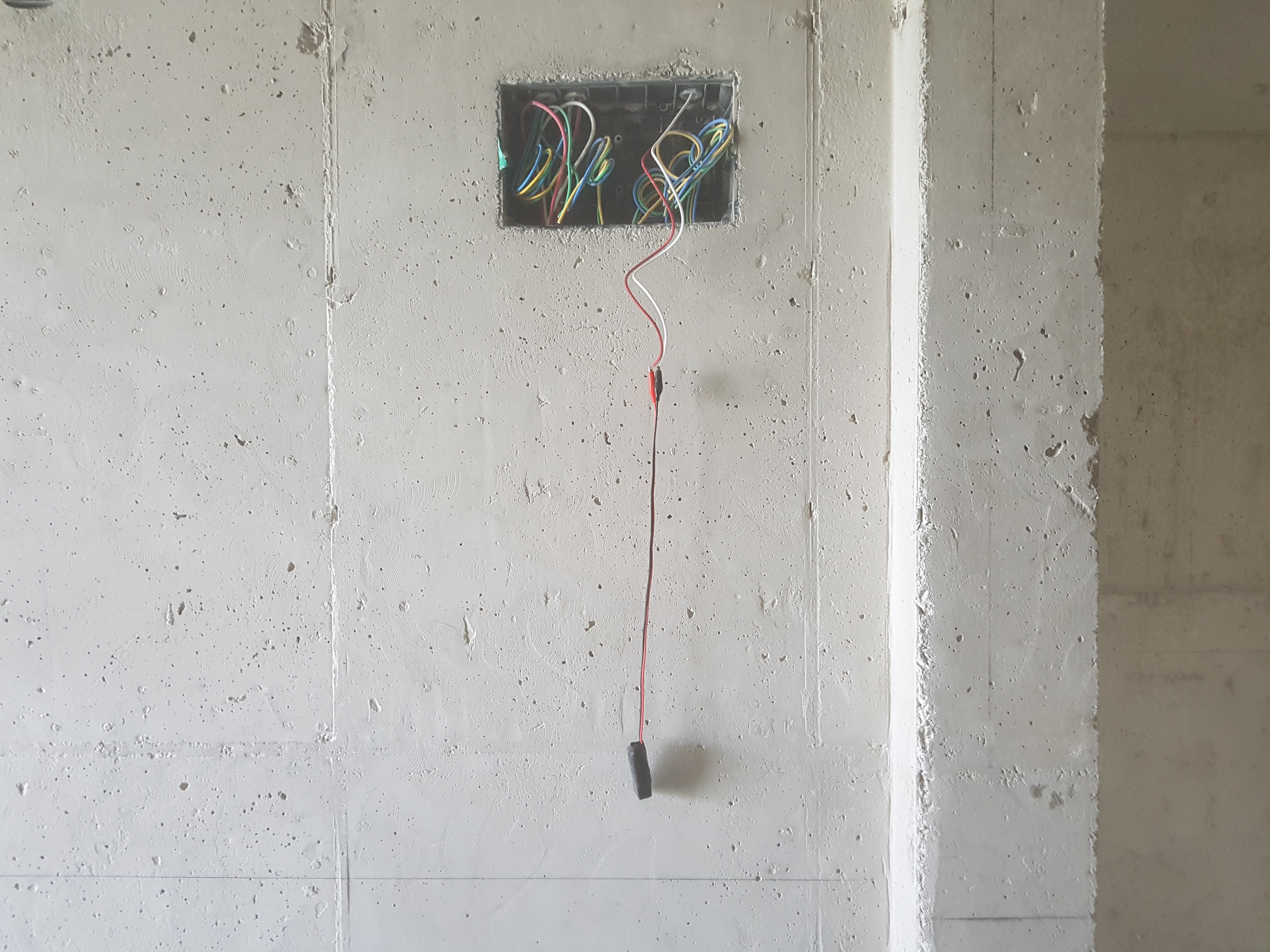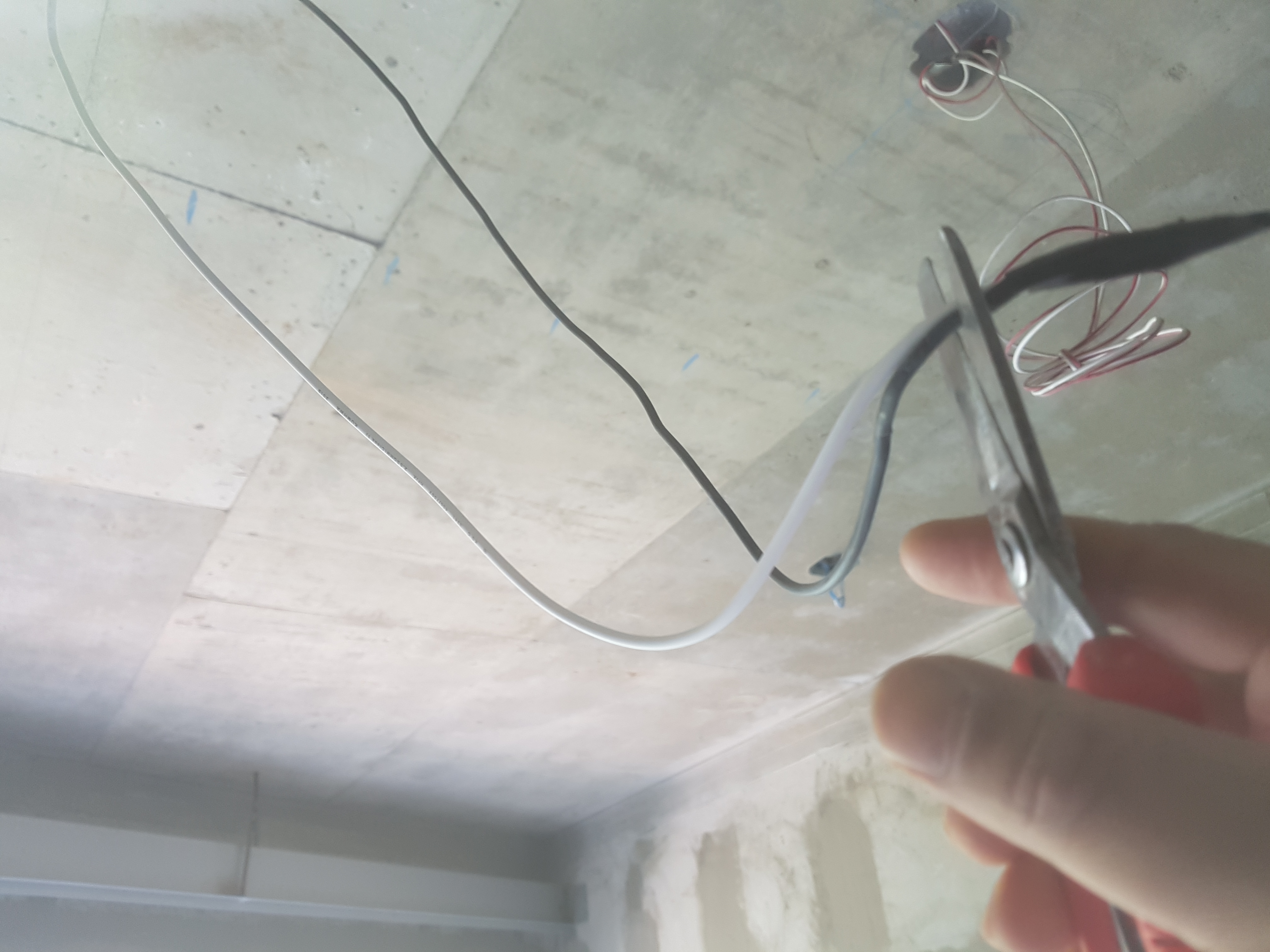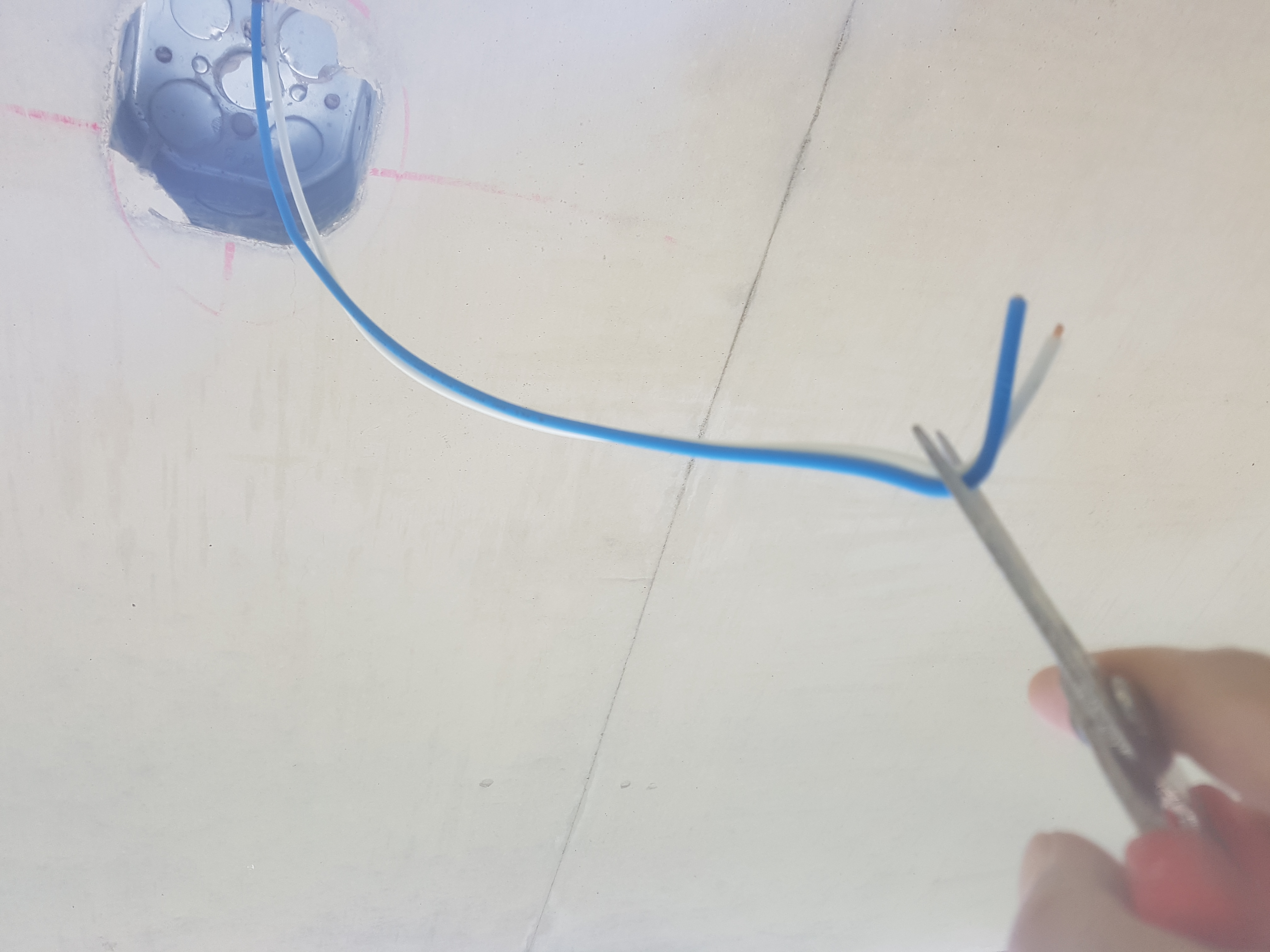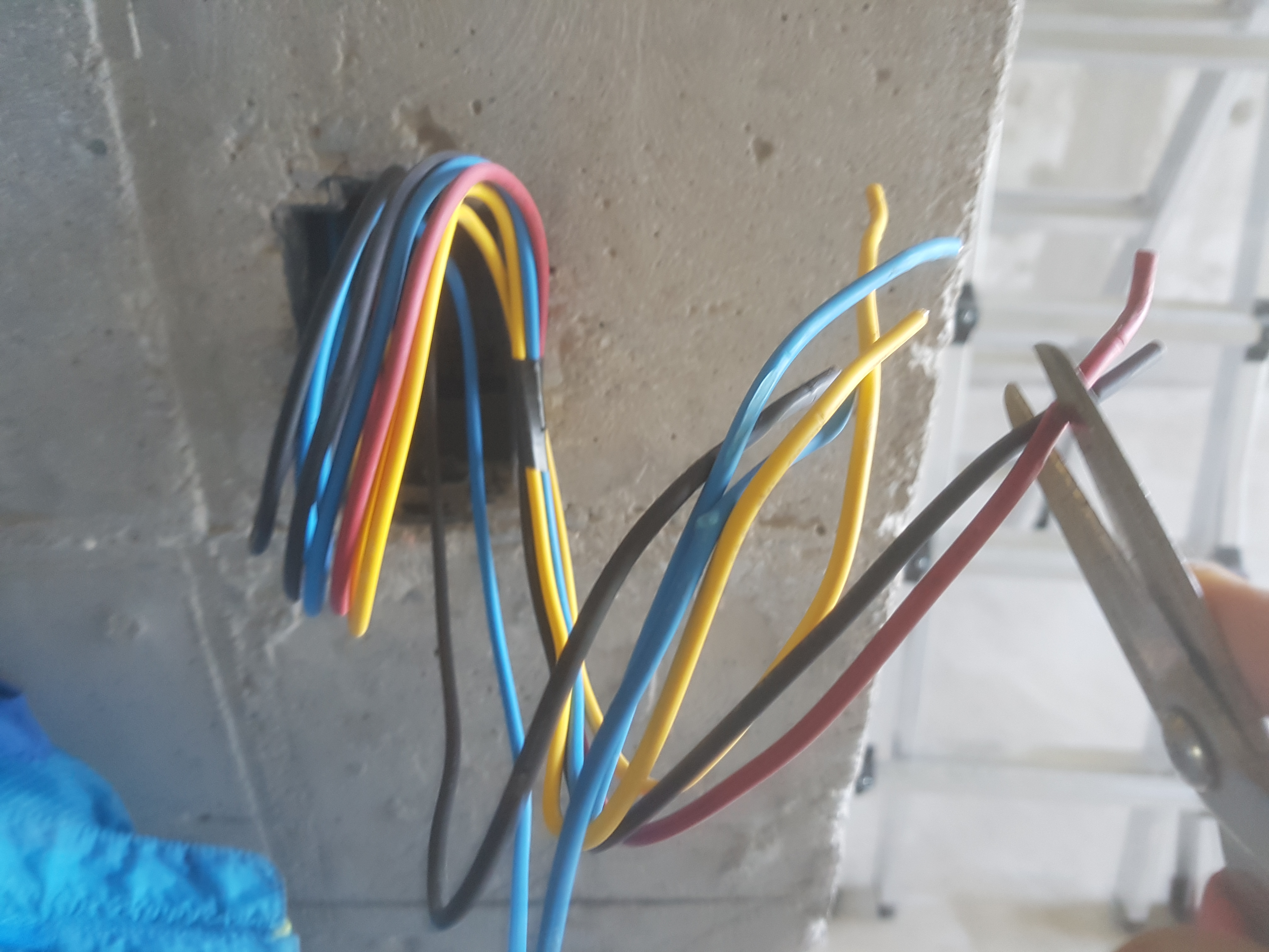 한명은 스위치의 검은색 전등라인을 가위로 빨간색(스위치공통)과 숏트를 시킵니다. 전선피복을 벚겨서 연결할 수도 있지만 현장에서는 빠르게 가위로 살짝 찝어서 숏트를 시킵니다.